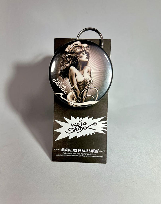 Přívěsek na klíče s otvírákem na korunkové uzávěry, s motivem "Com Comics" od Káji Saudka.