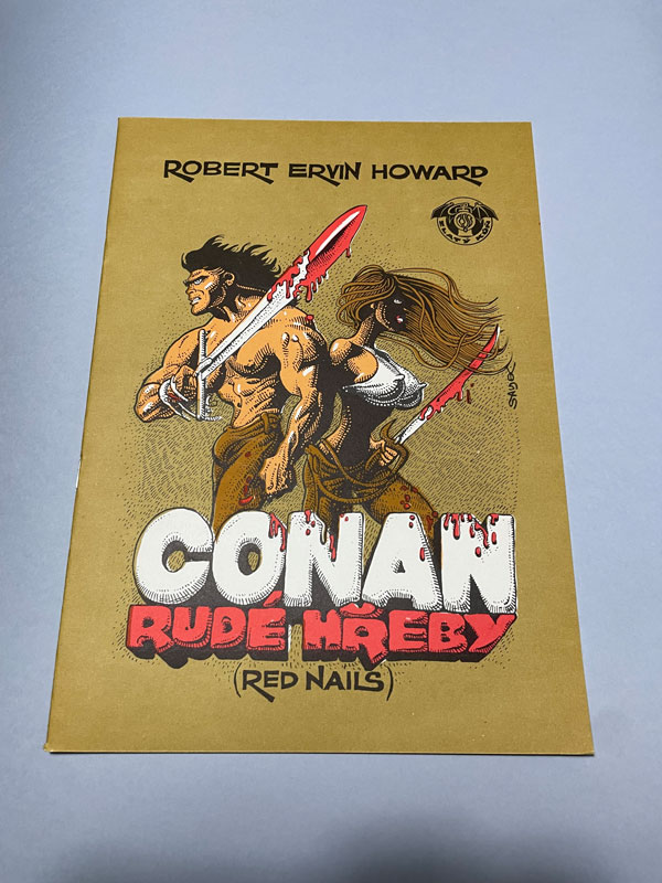 Povídkový sešit "Conan Rudé hřeby - Red nails" Druhé vydání 1990. Vydalo nakladatelství Zlatý Kůň ve spolupráci se Speleologickou společností a SFK Julese Vernea.